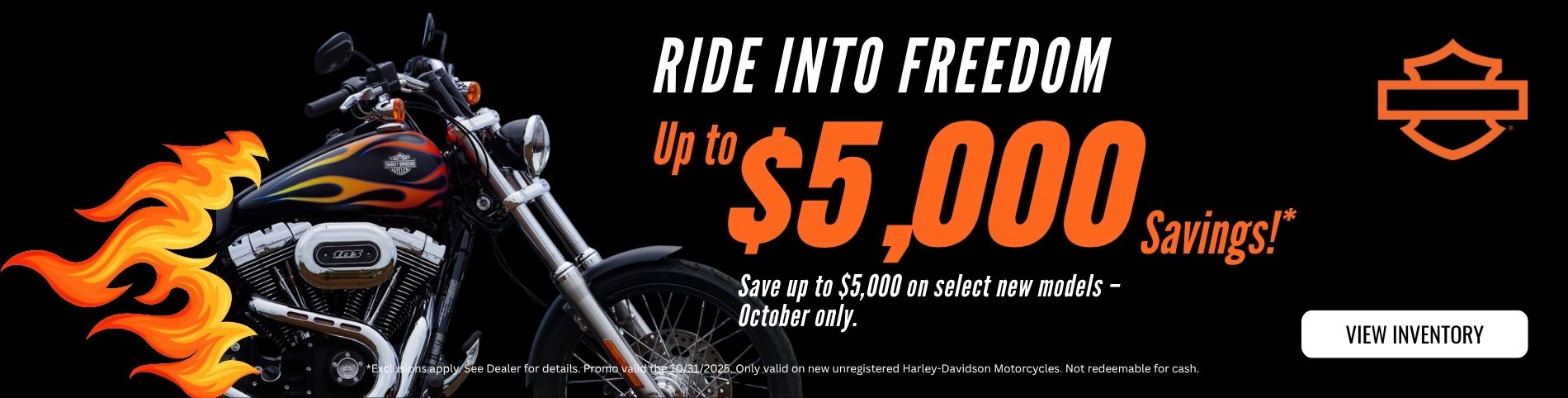 This October, we’re making it easier than ever to own the Harley you’ve been dreaming of. Enjoy up to $5,000 in savings on select new Harley-Davidson motorcycles currently in stock.