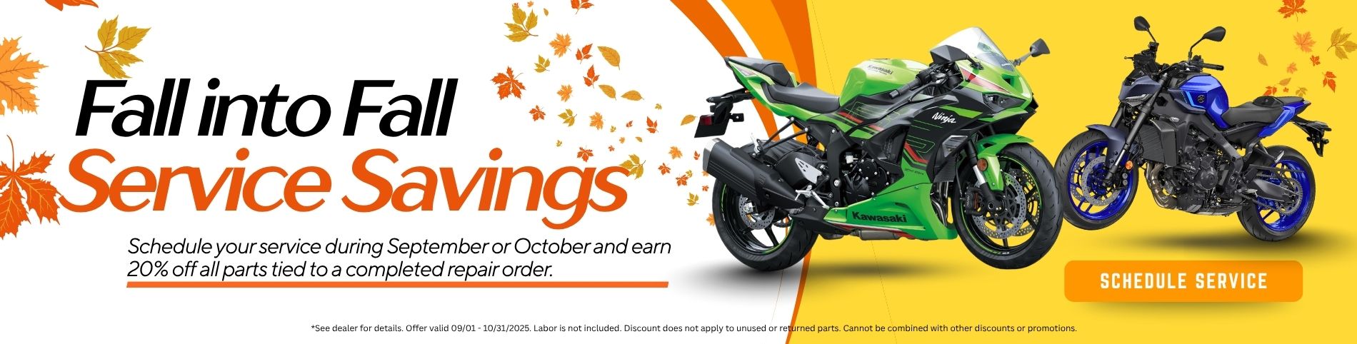 Get your machine ready for the next ride with our Fall into Fall Service Savings event. From Harley-Davidson to Kawasaki, Yamaha, and beyond, our factory-trained technicians keep your bike or powersports vehicle running at peak performance.